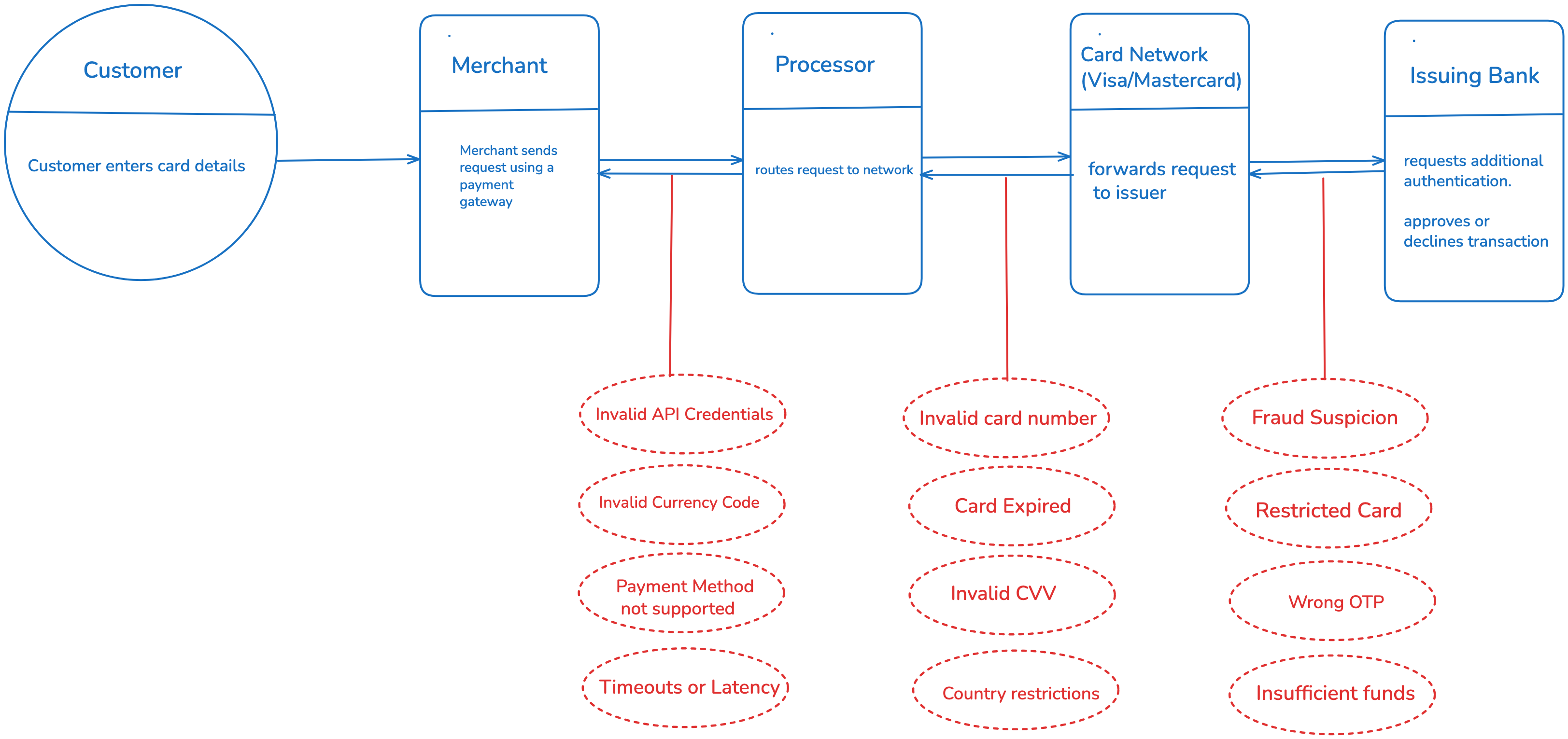 A soft decline is temporary (eg network timeouts, insufficient funds) and may succeed on retry. A hard decline (eg stolen card, invalid number, wrong PIN) usually can’t be resolved on retry. Developers need visibility into this funnel to know when and how to respond.